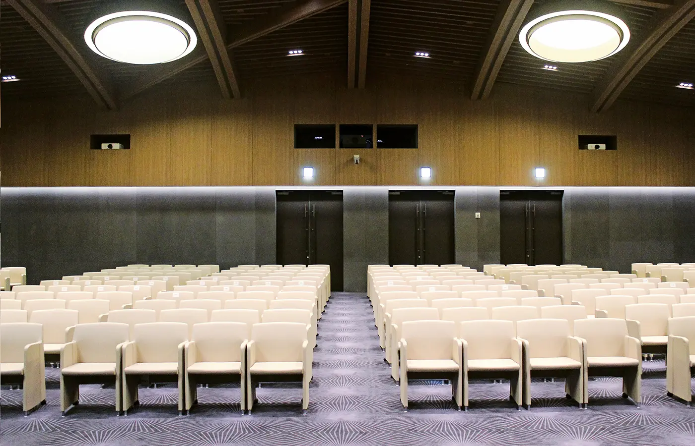 Folding club armchair, offered with castors or glides and available with writing tablet. It consists of three elements: body with armrests, folding sides and seat, all made from moulded fire-retardant Polyurethane (CL1), with steel inserts.