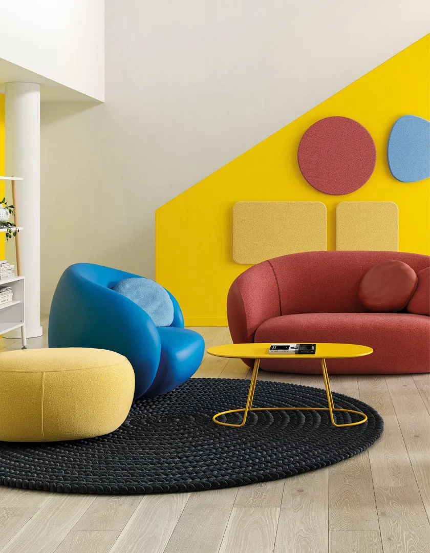 Lounge series with armchair, swivel armchair, two-seater sofa, pouf and small table. Soft and welcoming comfort is ensured by layers of foam with differentiated density and elastic belts under the seat. Armchairs and sofas come with separate covers for seat and backrest, while the pouf has a single cover.