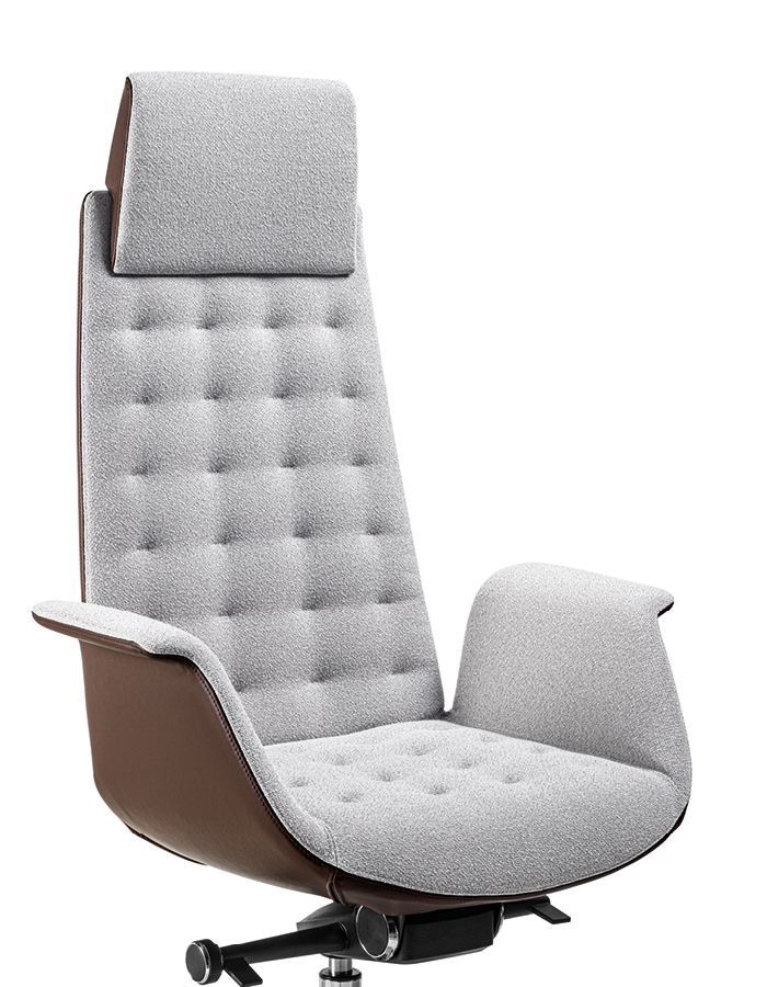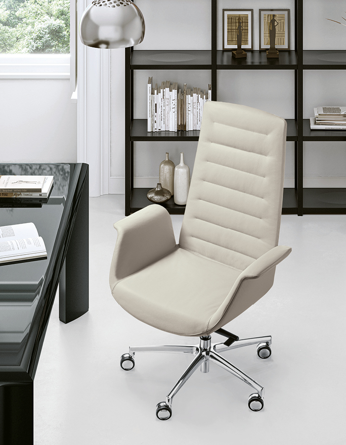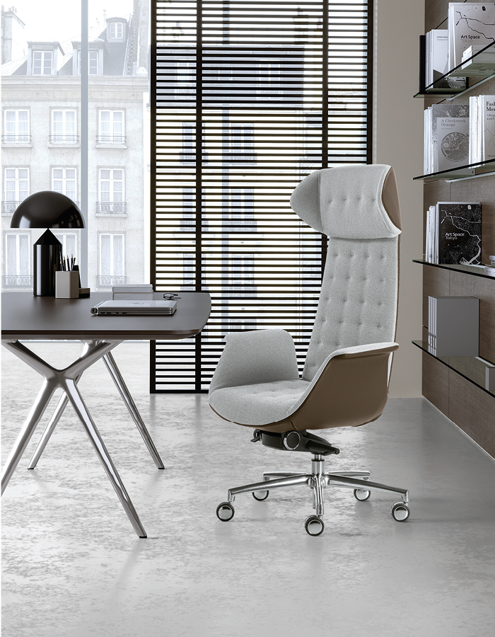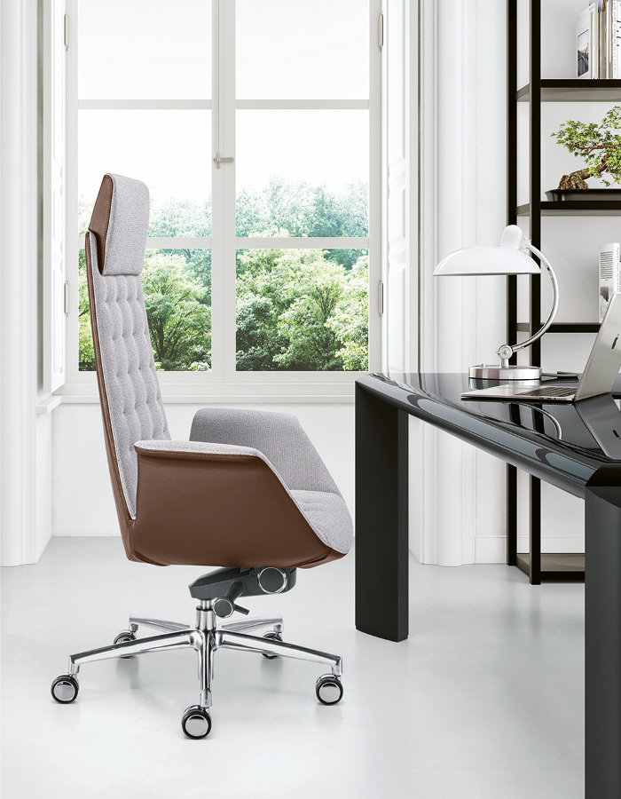 The Modà series expresses strong personality, emphasized by the choice of two headrests: the wide and enveloping EAR model, or a more compact version. Upholstery is available in three variants: Plain (smooth), Office (with horizontal stitching), and Style (capitonné). The line is completed by Modì, the meeting and guest version, which maintains the same design in smaller dimensions for aesthetic continuity.