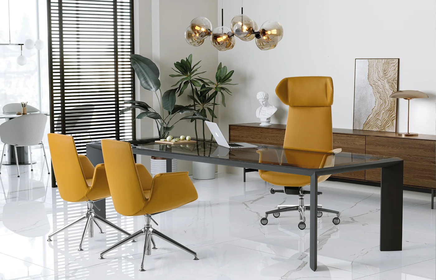 The Modà series expresses strong personality, emphasized by the choice of two headrests: the wide and enveloping EAR model, or a more compact version. Upholstery is available in three variants: Plain (smooth), Office (with horizontal stitching), and Style (capitonné). The line is completed by Modì, the meeting and guest version, which maintains the same design in smaller dimensions for aesthetic continuity.