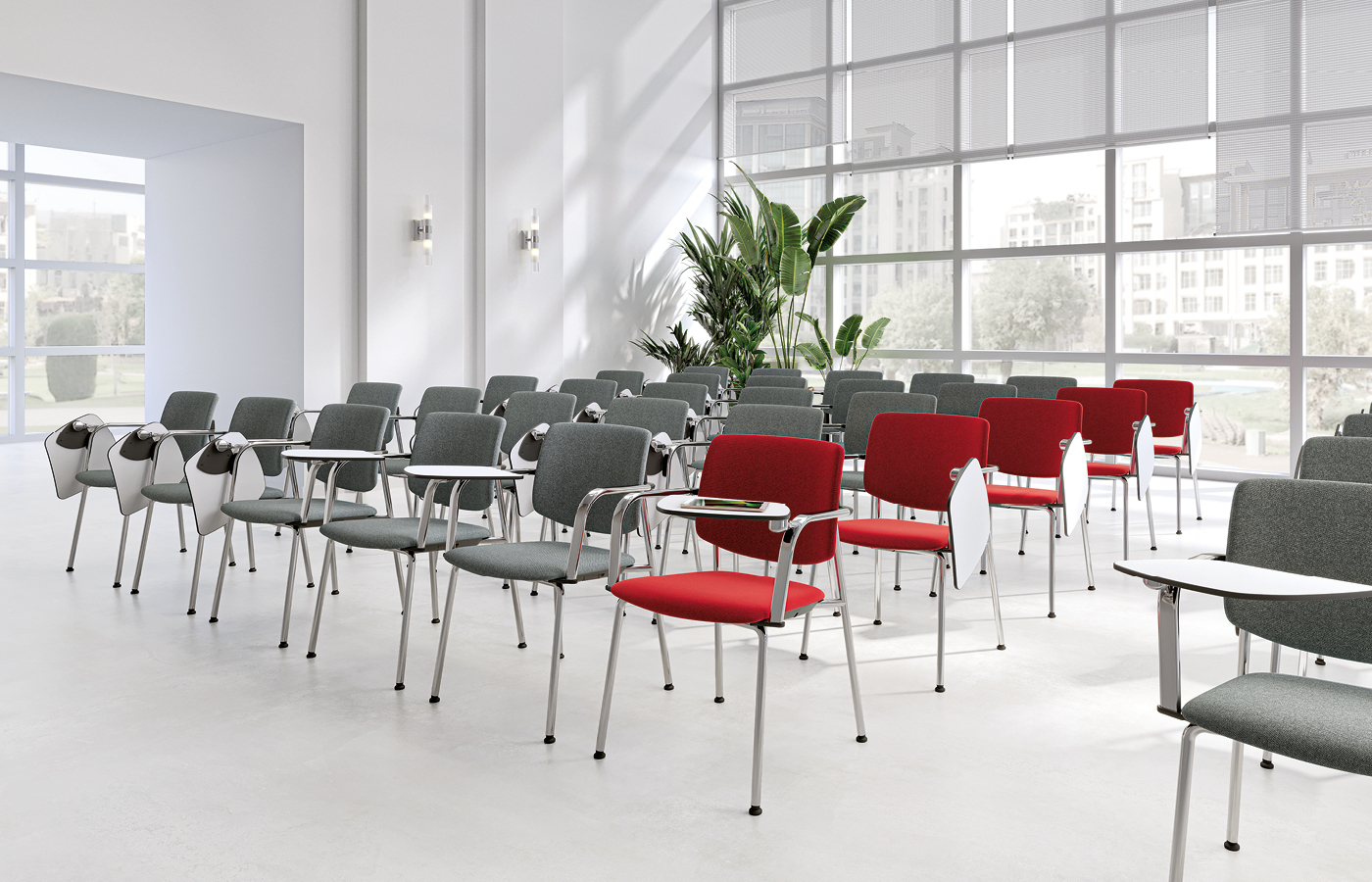 Series with separate seat and backrest. 4-leg or stackable sled base models, with or without armrests, or with writing tablet, swivel or beam-mounted versions.