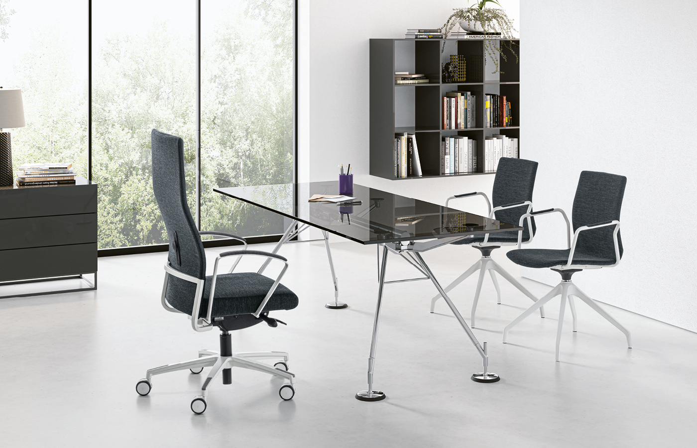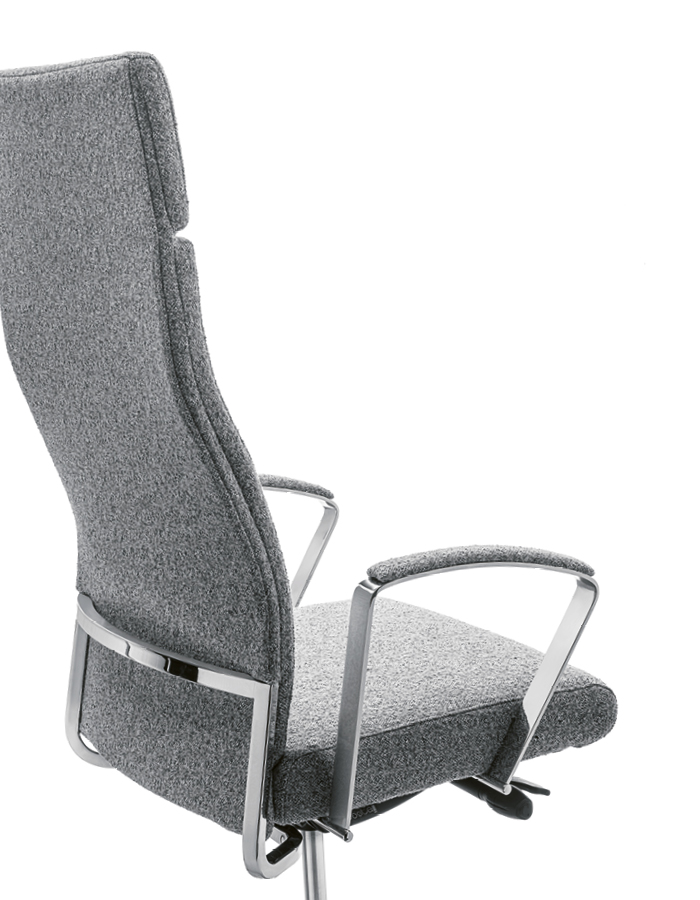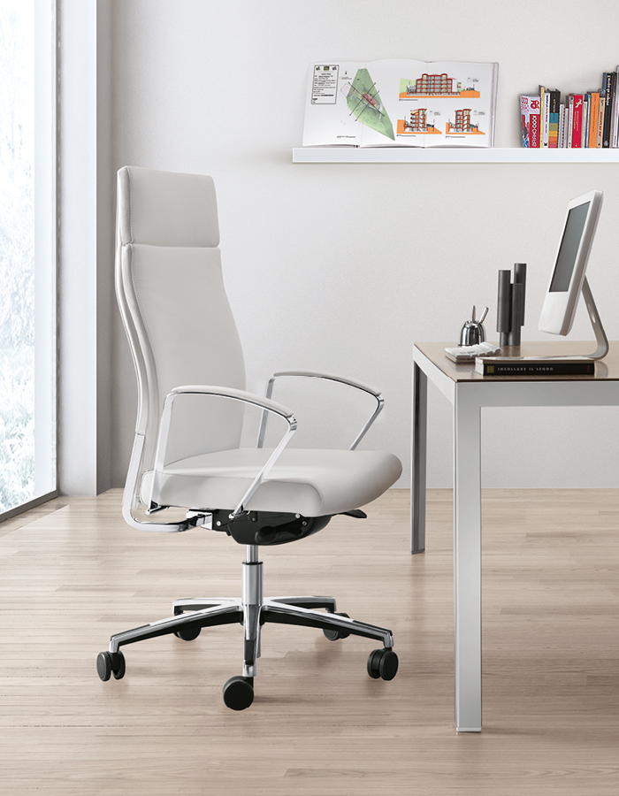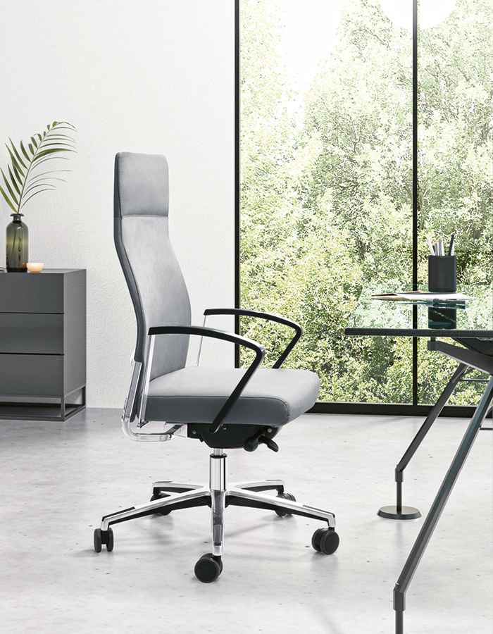 The WIN executive series is designed with a Green soul, thanks to components with low environmental impact. The exposed steel frame supports the backrest, available with integrated headrest or high back. Upholstery options include Slim (Win-S) and IM-Padded (Win-IM). Three armrest versions available: 7AC (steel with upholstered pad), 8PY (steel and Polyurethane), and 4BH (4D adjustable).
