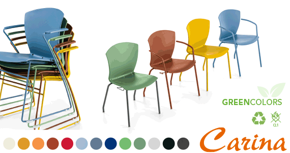 Déclinée en 13 coloris, la chaise Carina est fabriquée à partir de 65% de matériaux recyclés. Elle est ignifugée et conforme aux normes non-feu CL1/ITA ainsi qu’aux exigences environnementales.