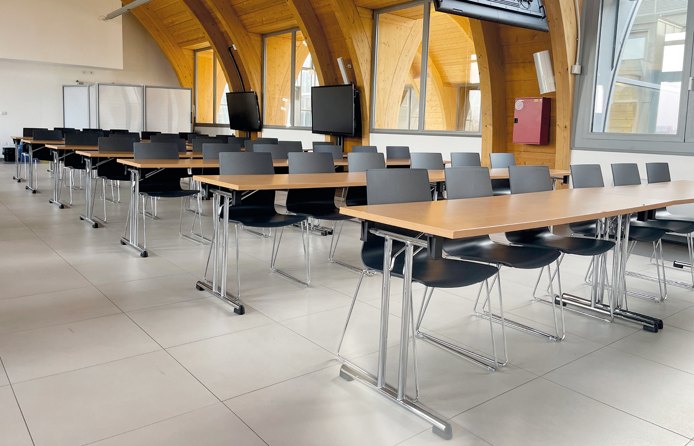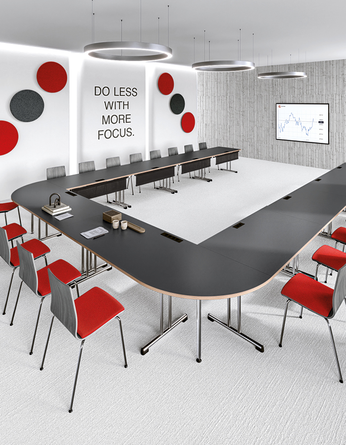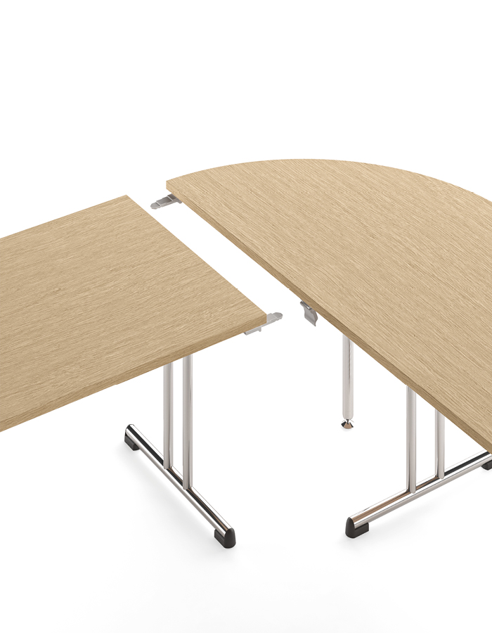 Série de tables “agrégables” et “empilables”. Idéale pour les espaces de formation ou de réunion nécessitant une reconfiguration fréquente. La table T-Fold est légère et pratique, manipulable par une seule personne. Dotée de pieds rabattables, elle s’empile facilement, puis se transporte aisément une fois placée sur chariot. La série T-Fold est proposée avec plusieurs finitions de plateaux en mélaminé ou stratifié, également disponibles en version FSC et ignifuge CL1.