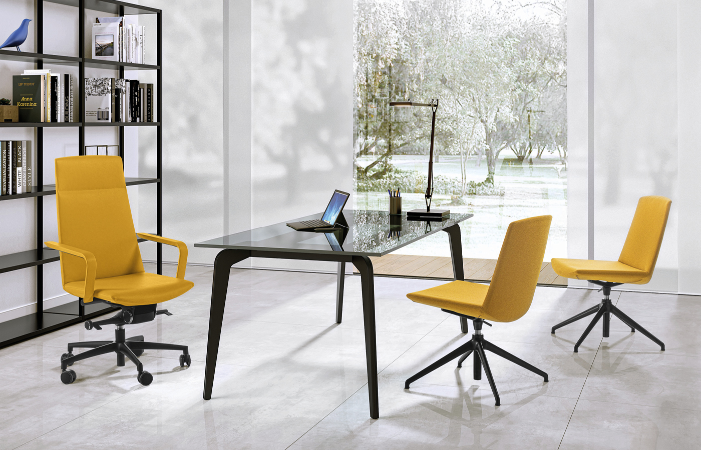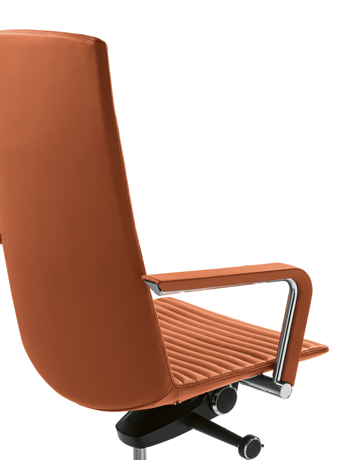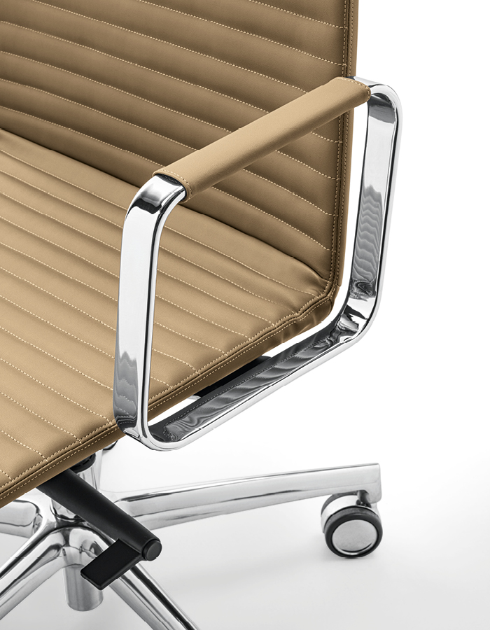 Essenziale e raffinata, la serie Mode presenta un design pulito, con tappezzeria Plain (liscia) o Strip (cuciture orizzontali). I braccioli in acciaio sono disponibili in due versioni: il modello “aperto”, con tubo d’acciaio a vista e poggiabraccia rivestito o in Poliuretano nero, e il modello “chiuso”, proposto
