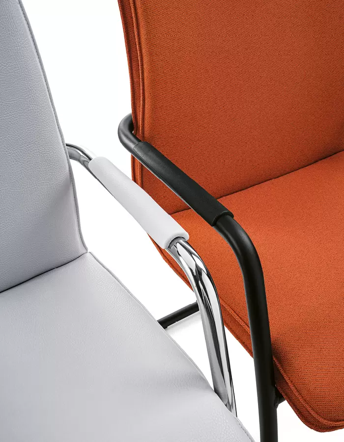 Serie direzionale caratterizzata da dettagli importanti: spessori sottili che le conferiscono eleganza, ottima qualità della tappezzeria e braccioli in acciaio di buona fattura, rendendola ideale per essere abbinata a tavoli e scrivanie dal design minimalista. L’imbottitura, pur essendo compatta, offre un ottimo confort, grazie al disegno ergonomico della monoscocca. I braccioli, realizzati in piatto d’acciaio, hanno finitura cromata oppure nera e sono rispettivamente abbinati alle basi in alluminio lucido oppure in Nylon di colore nero.