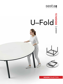 Serie di tavoli “aggregabili” e “impilabili”. U-Fold è stato concepito per soddisfare l’esigenza di chi ricerca tavoli di grandi dimensioni, come ad es. i tavoli per banchetti. La struttura in acciaio del tavolo U-Fold è robusta ed è concepita per poter facilmente ripiegare le gambe della struttura e quindi di caricare più tavoli su di un apposito carrello e di trasportarli in altro ambiente. La serie U-Fold prevede l’utilizzo di tradizionali piani melaminici o in laminato.